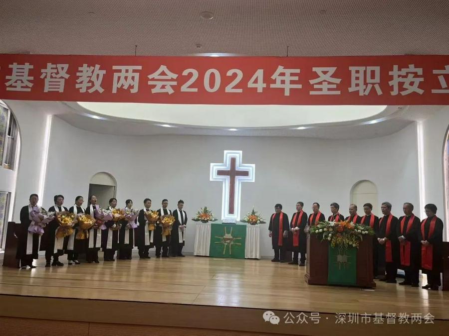 2024 年 11 月 9 日下午,深圳市基督教两会在深圳市宝安区基督教宝安堂隆重举行牧师圣职按立典礼,按立李信方、刘建龙、李虎云、张君(女)、张玉璇(女)、毛春英(女)林曙(女)、范烨恒(女)八位为牧师,宣布毛春先(女)副牧师晋升为牧师。此次,圣职按立典礼不仅是对九位同工个人信仰与奉献的肯定,也为深圳市基督教人才建设注入了新的血液,更是对广东省基督教事工发展的有力推动。