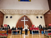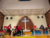 根据要求每个团队设置一句口号,赞美队口号“牢记圣言,遵行主话”;马大队口号“追求真理,智慧入心”;天使队口号“遵行神道,永不跌倒”;精兵队口号“圣言常存,导我前行”。每个团队在入场以及得分以后,亲友团高呼口号鼓舞士气。