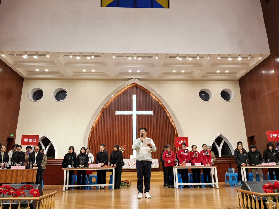 本次比赛由诗班组(赞美队)、值班组(马大队)、天使乐队(天使队)、姊妹团契(精兵队)四个代表队十六位选手参加,每个团队邀请四到五位亲友团。特别邀请昆山市基督教三自爱国会主席、淀山湖堂主任闻新贵牧师,淀山湖堂副主任俞惠琴牧师以及二位义工传道为本次评委,六位同工担任计分员。
