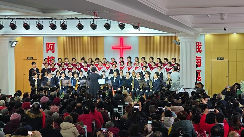 在牧师的主领下,诗班乐队在《圣诞感恩歌》的号声中缓步走进圣台两侧就位,会众侍立同唱新编赞美诗第71首《平安夜歌》之后,教堂多位牧师先后登台进行祷告以及经文诵读。