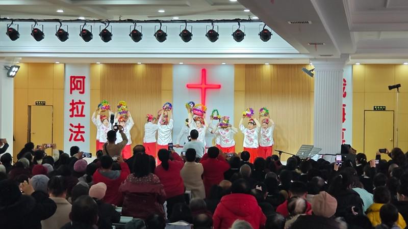 证道结束后,平安夜感恩纪念演出也正式开始。在4个小时的演出中,来自全县各个基层片区与聚会点的弟兄姊妹先后向神献上了舞蹈、诗歌、演奏、圣剧、小品、三句半等多样的节目,颂赞基督降生的喜乐与感恩。