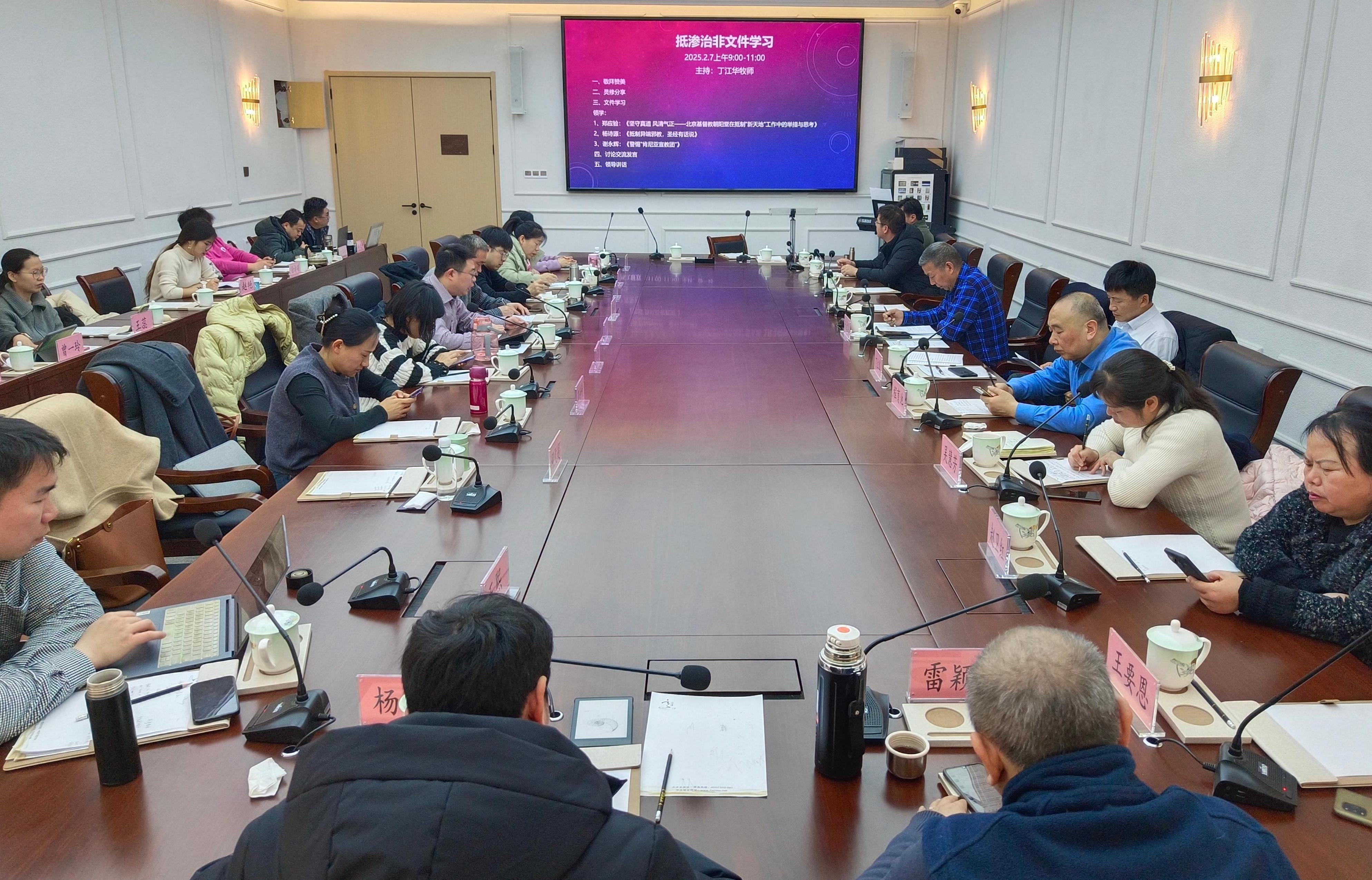 2月7日,退修会举行“抵渗治非”学习会。会议通过学习《坚守真道 风清气正——北京基督教朝阳堂在抵制“新天地”工作中的举措与思考》等文章,深入辨析异端邪教本质,筑牢思想防线。