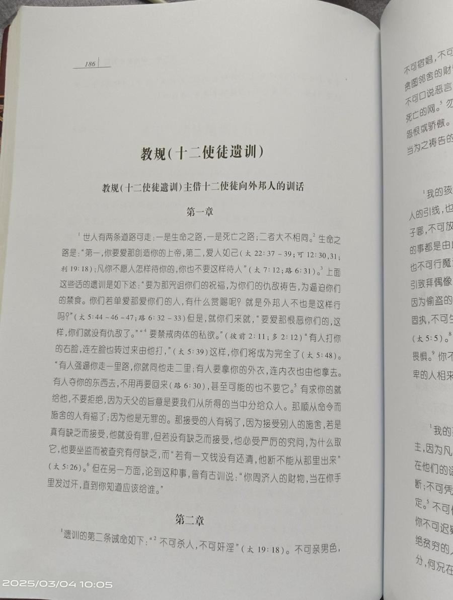 《十二使徒遗训》的名称体现了古代基督教对使徒传统的尊崇——即使作者不详,只要内容被认为承载了使徒的教导,便会被冠以“使徒”之名。这种现象在早期文献中十分常见,反映了当时教会通过文本确立权威与正统性的需求。但它被称为“十二使徒遗训”的原因主要与其内容和传统信仰有关,而非确凿的作者身份。尽管作者不能确定就是十二使徒,但这部文本的内容被认为反映了早期基督徒对十二使徒教导的继承。书中讨论了教会生活的基本规范(如洗礼、圣餐、道德准则等),而这些内容被传统视为与十二使徒的教导直接相关。书中可能整理自使徒时代的口头教导(如“主的道”),并通过早期教会的领袖或匿名作者记录下来,以此确立教义的连续性。就如同我们中国的《论语》并不是孔子亲自著述的一样。早期文献也有这样的惯例,在早期基督教时期,许多文献会以“使徒”或“某某门徒”名义流传,即使作者并非使徒本人。就是圣经也是这样,例如,马太福音和马可福音最初也匿名,但后来被归因于使徒或其追随者;路得记作者不详、撒母耳记上、撒母耳记下作者不详,推测可能是以色列王国分裂时期的人;列王纪上、列王纪下作者不详,有人认为可能是耶利米,但证据不足;历代志上、历代志下作者不详,传统认为是以斯拉;以斯帖记作者不详;约伯记作者不详;希伯来书作者不详……随着时间推移,“十二使徒遗训”的名称逐渐成为其固定称呼,更多是基于内容的归属而非作者考证,至于究竟谁是作者已经不重要了,重要的这是使徒留给后人的教导、教训,也是我们应该参考和遵循的。