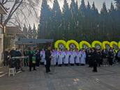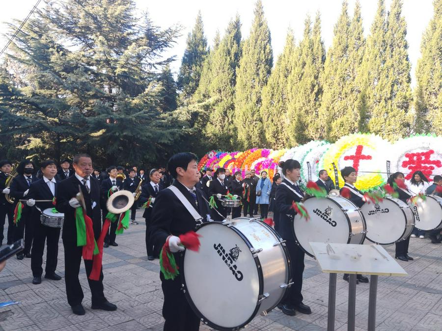 3月21日早上8时30分,临汾市尧都区殡仪馆慈容厅,一场经过精心筹备的追思礼拜在这里举行。电子屏幕上“张宝贵弟兄追思礼拜”的会标格外引人注目,两旁的挽联分别是“教书从政奉献一生曲沃临汾留美名,爱神爱人嘉言懿行言传身教满馨香”。后边灵前的挽联是以他的名字所作“嵌名”挽联:“宝血涤尘归主爱息劳苦荣天国,贵胄怀仁效基督馨香满人间。”鲜花丛中,父亲慈祥和蔼的面容依旧望着大家,两旁还有三十多个各色花圈寄托哀思,现场气氛庄严肃穆。临汾市尧都区基督教会三十多人组成的联合乐队首先奏乐,他们身着蓝色西服精神抖擞,神情庄重,击鼓奏乐,哀乐低回中,全场一百五十余人低头默哀。其中有从外地赶来的亲友,也有家乡闻讯赶来的代表30余人。