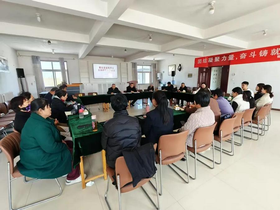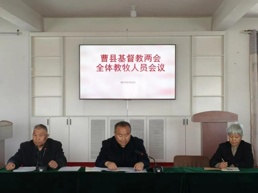 2025年4月5日上午,山东省菏泽市曹县基督教两会召开全体教牧人员会议,深入学习贯彻全国两会精神,总结部署全县基督教当前重点工作。县基督教两会班子成员、各牧区教牧人员共33人参会。会议由县基督教两会副主任副会长赵景柱长老主持,副主任副会长王守珍牧师带领祷告。