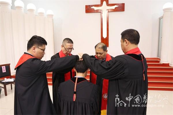圣职按立礼由王孟坤牧师主礼,陈光旭牧师引荐同工。韩其富、李国成、冯超3人被按立为牧师,周福星、于春玲(女)、刘建利3人被按立为长老。王伟牧师对同工们进行了劝勉。典礼在新按立的韩其富牧师的祝福中圆满礼成。