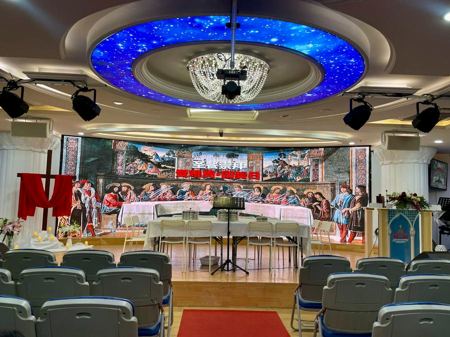 接着,牧师为大家派发圣餐,现场重现最后晚餐场景,每12人一组,依次上台领受圣餐。