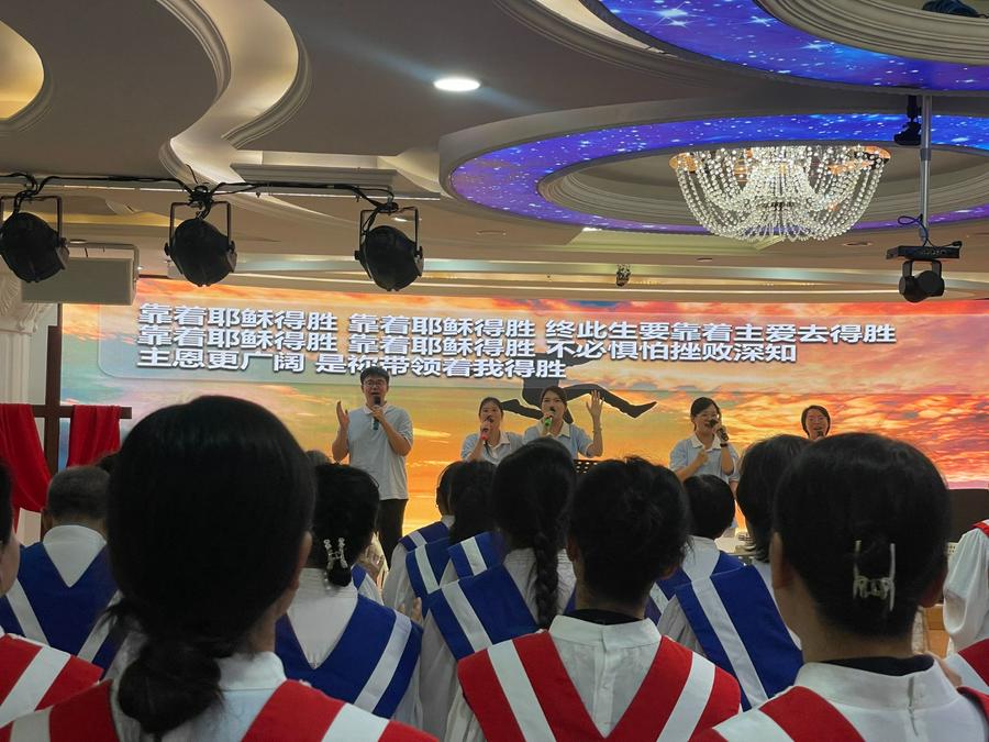 证道结束,由诗歌敬拜团带领会众献上《耶稣 耶稣》《何等恩典》《靠着耶稣得胜》三首回应赞美诗。