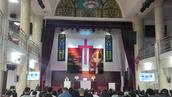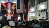 黄昏时分,教堂灯火通明,大家陆续从四面八方赶来,满怀感恩敬畏之情。进入大堂,鲜花点缀的《最后的晚餐》的巨幅油画引人注目,在这个特殊的夜晚给人无限的遐想。堂内早已座无虚席,赞美的歌声回荡四方,“十字架,十字架,永是我的荣耀,我众罪都洗清洁,唯靠耶稣宝血——”