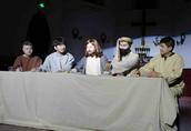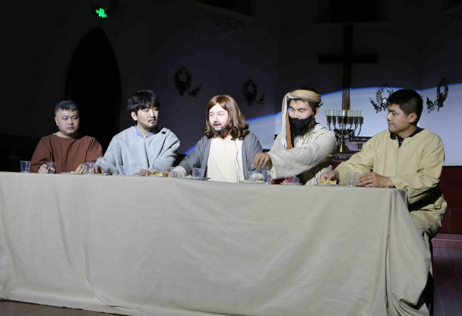 第一幕是最后的晚餐。人物是由信徒扮演的耶稣、彼得、犹大和其他门徒们。通过他们的演出,看到了当时门徒在困惑与挣扎之中寻找答案。在那星光闪烁、透着寒意的夜晚,按照主耶稣的吩咐,门徒预备了一顿看似普通的晚餐,这却成为了改变人类历史的关键时刻。那一夜,耶稣与他的门徒们共进最后的晚餐,并且亲自为门徒洗脚,一场关于爱、谦卑与背叛的较量,即将拉开帷幕。