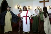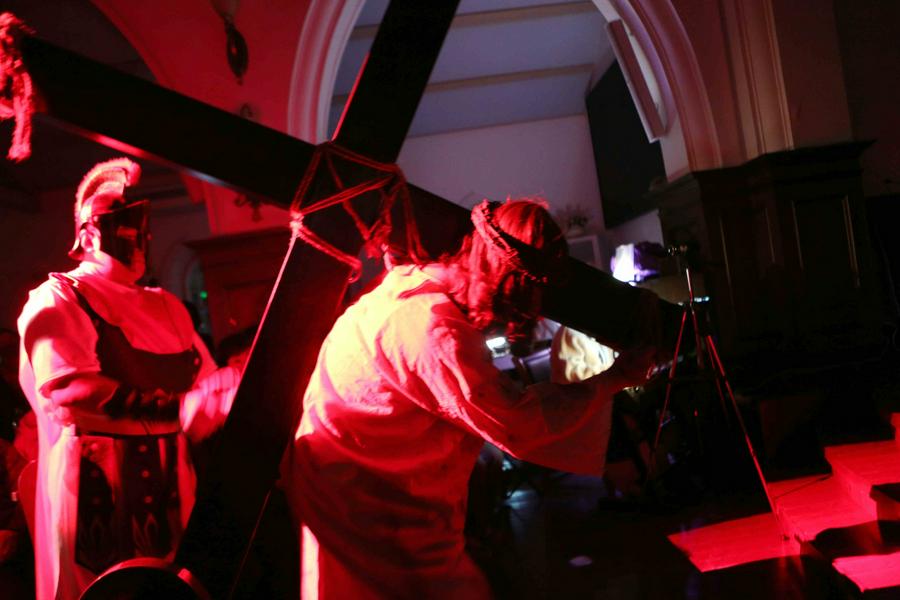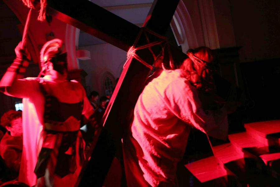 黑暗中,在场的信徒们听到了那痛彻心扉的鞭挞的声音和士兵的大声呵斥声,此时观众的心真的是都要碎了。扮演主耶稣的同工背着那沉重的十字架,从教堂正门一步、一步地走向圣台,而且还一再跌倒(那个道具十字架非常沉重,我事先试着没有搬动),门徒们四散逃离。曾信誓旦旦至死不渝的彼得,也在黑暗中愧疚躲避,经受着信心的极大考验。