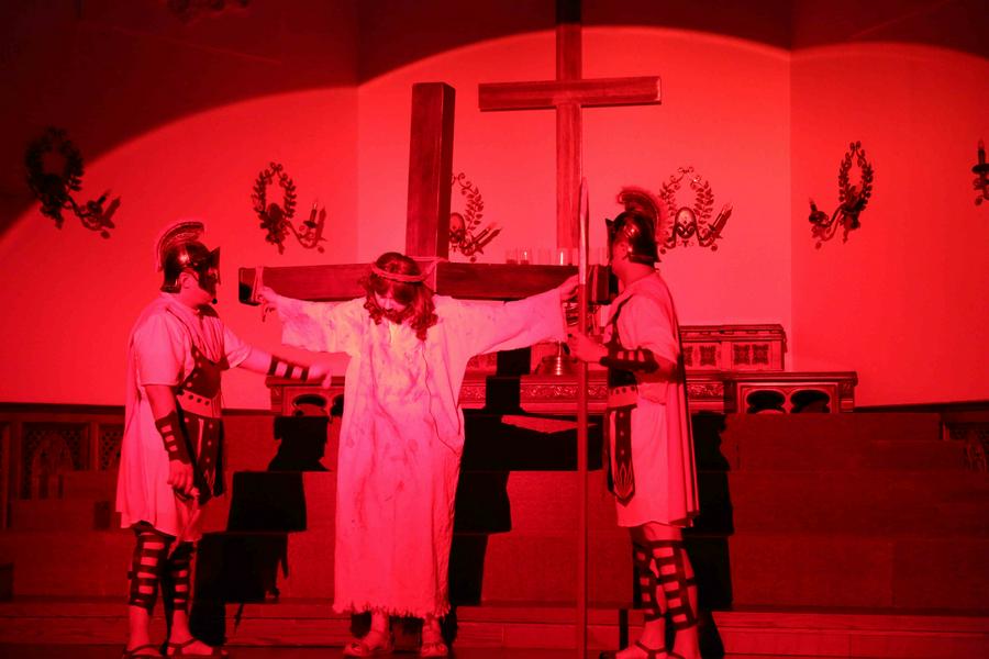 舞台上,人们看到士兵将我们的主耶稣钉在了十字架上,有一个兵拿枪扎他的肋旁,随即有血和水流出来。但历史从未在绝望中停滞,死亡也无法锁住真正的生命。就在所有人以为一切已终结之时,一个新的开始即将到来。