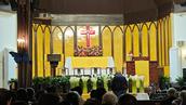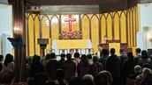 洗礼之后,青年诗班献唱赞美诗《为基督舍命》,高英牧师引用约翰福音20章19-20节以及彼得前书1章3-5节经文分享了证道《因祂活着》。