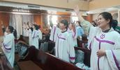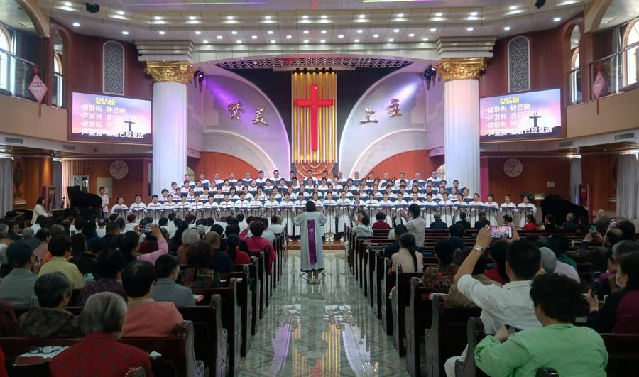 上午9:00,为庆祝主复活举行的圣餐礼崇拜聚会在会众齐祷及主持人陈剑代祷后开始了。首先是教会老年诗班登台献唱赞美,诗班弟兄姊妹登上主台后,在优美钢琴音乐伴奏下,向主献上了《称谢复活主》《与你同尊荣》两首赞美诗歌。其次是约书亚迦南诗班登台献唱赞美,诗班在白雪姊妹指挥下,气势磅礴献唱了《复活颂》《哈利路亚基督复活》两首赞美诗歌。随后,主持人陈剑带领大家宣信了《使徒信经》。