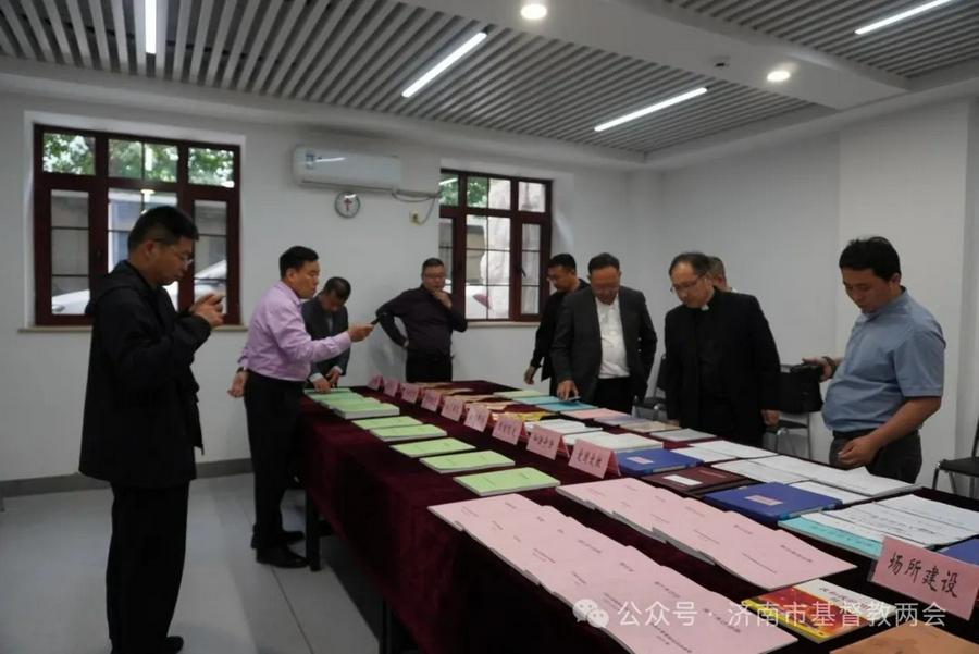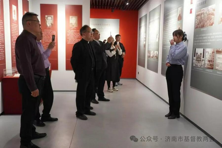 在经四路教堂,专委会一行参观了济南市基督教中国化历史教育展厅。现场观摩了经四路教堂近几年在系统推进基督教中国化、坚持全面从严治教和场所规范化建设等方面的经验做法,翻阅查看相关台账资料。