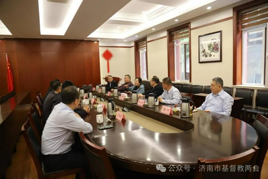 在市基督教两会驻地,市基督教三自爱国运动委员会主任赵克玉同工、市基督教协会会长段国山牧师等驻会班子成员介绍了济南教会基本情况,分享了“会通海右·基督教和融思想探索与实践”主题工作计划。双方围绕坚持基督教中国化方向办好教会、系统推进基督教中国化、坚持全面从严治教、团体规范化建设、推动神学思想建设落地生根等事工进行了热烈讨论。
