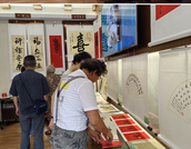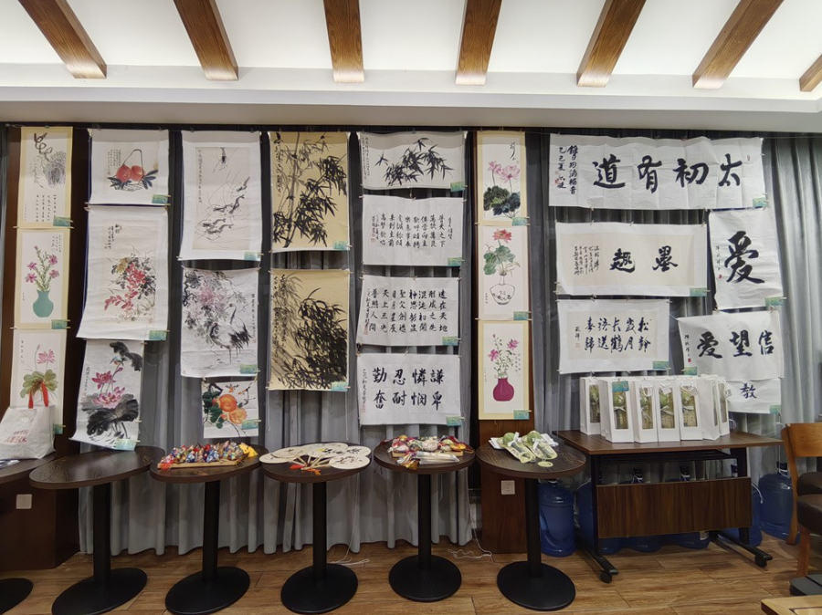 经过近二个月的精心预备和创作,共筹集到22位作者的95份作品。亲情中心自愿者姐妹们耐心细致地为每一份作品贴上包含作品名称、作者名字、作品尺寸等信息的标签,在内宾室或悬挂或平放,分门别类、错落有致,展示得十分漂亮。内宾室瞬间被满满当当的书画作品占领,原本典雅的内宾室更升华成了艺术的殿堂,满满的笔墨书香溢出来。这次作品有老年书画班的学员作品,有书画爱好者的作品,更有专业书画家的作品。筹备组还精心挑选预备了端午节的“周边”系列,有薰衣草香囊、艾草健康锤、故宫文创织绣卡、非遗藤编手工腰扇、装饰手绳、经文祝福书签等,把书画艺术和端午传统文化巧妙地结合在一起,让内宾室变成了书画艺术苑、端午文化苑。书画作品内容、样式也十分丰富,书法有小篆、隶书、楷书、行书作品,国画有花鸟写意、工笔作品;形式有挂轴式、扇式、圆形、方形,还有大型成册作品及画在精美的小团扇、卡片上的作品,真是琳琅满目、目不暇接。