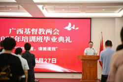 广西基督教三自爱国运动委员会主席王从联牧师在典礼上以《主是窑匠,我是泥土》(经文:《耶利米书》18:1-12)为题证道。王牧师向毕业生们提出两点勉励:首先,要永远尊主为大;其次,要永远在基督里。他阐述了耶利米先知在其时代作出了合神心意的抉择——将生命主权交付给主,并在逆境中展现出坚韧不拔的精神,靠主得胜。他强调,在新时代背景下,毕业的学员们应找准自身定位,明确服侍方向,怀揣对国家和民族的深厚情感,成为爱国爱教的基督徒,为主做光做盐,无论处于何种环境,都应仰望并依靠主,保守自己常在基督里。王牧师鼓励学员们积极投身于系统推进基督教中国化广西实践,为广西教会的健康传承和铸牢中华民族共同体意识贡献力量。