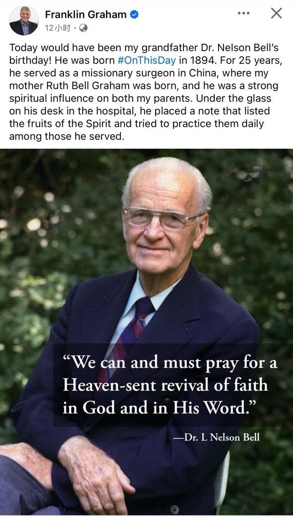 在钟爱华(Nelson Bell)生日这天,他的外孙葛福临牧师在社交媒体上追忆了钟爱华在中国服侍中的难忘场景,并称外公在属灵方面给了他父母(葛培理牧师和钟路得)很深刻的影响。