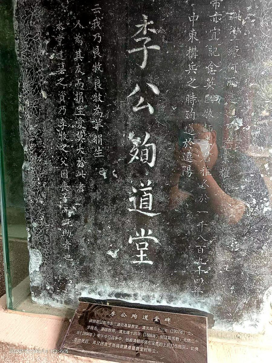 第二次重建辽阳教堂是这样的:1894年中日甲午战争中,清廷调吉林靖边军赴朝鲜增援,路经辽阳时,有七名士兵砸了教堂的玻璃门窗。李雅各闻讯后,拟去辽阳州衙门交涉。途经教堂,遇肇事士兵,士兵误认为李雅各是日本人,遭拳打脚踢,致伤严重,送到辽阳当地医院治疗,当晚死亡。事后李雅各父亲将此事状告到清廷,据有关史料记载:“有传教士被害,兹事体大,清廷上下高度重视,案件迅即处理了结:依大清律例首犯正法、从犯充军,并赔偿纹银7千两抚恤家属。”就是说李雅各牧师的父亲获政府7千两白银的赔偿。他将此抚恤金全部捐助辽阳教会建基督教礼拜堂(“两建”)。教堂设计者是英国芦佐治工程师。1907年,礼拜堂建成,东墙上镶有“李公殉道堂碑”以志纪念。也就是现存在辽阳博物馆的那座石碑。