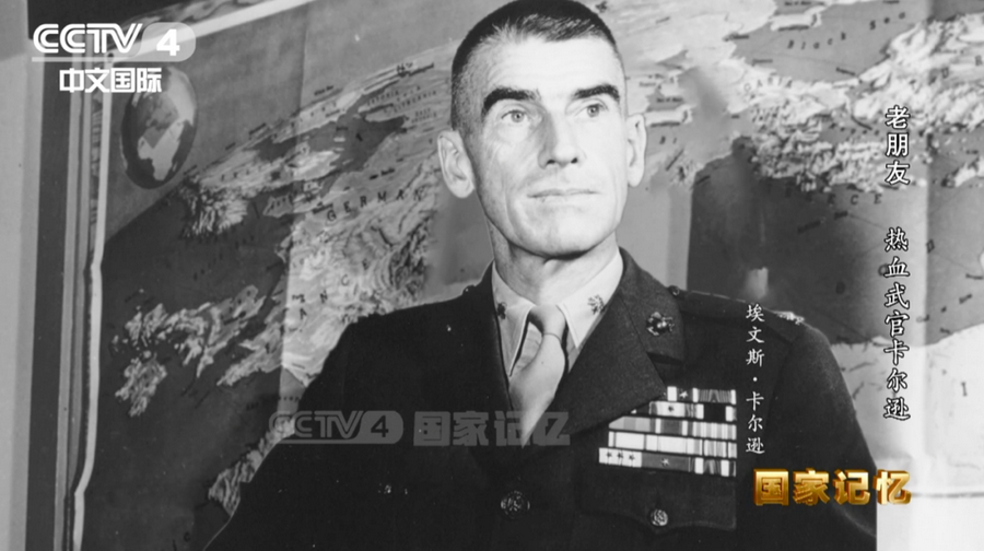 抗日战争时期,美国人埃文斯·福代斯·卡尔逊(Evans Fordyce Carlson)是一位极具传奇色彩、对中国抗战产生过重要影响的美国海军陆战队军官。他与中国有着很深的情结,创造了四个第一:是第一位深入中国共产党敌后抗日根据地考察的美国现役军人;是第一位与延安亲密接触的基督徒美军军官;第一位向时任美国总统罗斯福直接以书信形式汇报中国抗日战场情况的美国人;是第一位将八路军的游击战经验带回美国,在太平洋战争中加以运用,成为美军“游击战之父”的人。