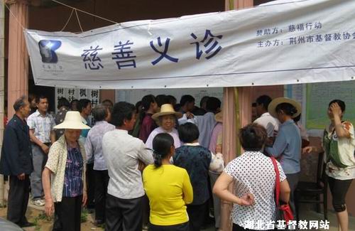 4月29日,荆州市基督教协会于监利县枫树村开展爱心义诊免费送药慈福行动,诊治病患近400人,免费发放药品1万元,为乡村群众带来了健康的福音。从2008年以来,荆州市基督教协会每年都要开展6次这样的爱心义诊活动。