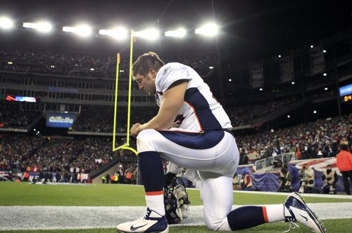 上周末,丹佛野马队基督徒四分卫蒂姆蒂博出现在美国一所教会,讲述怎样引发“蒂博潮”,及贴在眼睛下面的《圣经》经文的故事,并现场为邀请耶稣基督进入自己内心的人祷告。
