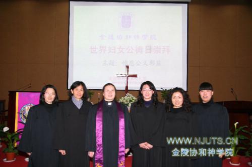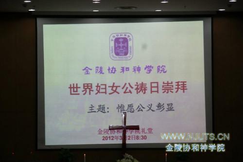 2012年3月2日上午,南京金陵神学院全体师生举行了世界妇女公祷日崇拜。本次公祷日的主题是“唯愿公义彰显” ,由马来西亚教会姊妹发起。神学院刘美纯老师主持,孙美慈牧师证道,另邀请了女教师和同学一同参与公祷日崇拜。
