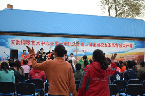 2012年5月18日晚6点,在赞美声中“天韵人”期待已久的天韵钢琴艺术中心第二届全国校友圣乐营顺利拉开了帷幕,此次开营礼拜于辽宁省瓦房店迦南美地养老院院内举行,出席者有天韵历届部分校友及教师共一百余人。