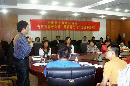 4月24日晚七点在合肥市基督教堂会议室举行“百名好父母培训”开班典礼。薛连喜牧师致开幕辞,他指出此次培训得到全国基督教两会的大力支持,在全国是独一无二的先河之举,为基督教社会服务探索开创出一条新途径。