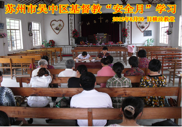 2012年6月30日,最后一期“安全月”活动在吴中区横泾基督教堂举行,共22位同工参加,马丽青老师带领大家一起学习《宗教事务条例》和相关法律法规及政策。至此“安全月”的活动学习取得圆满结束,最后顾菊英主席作了结束祷告。