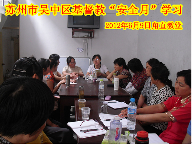 首次学习于2012年6月9日在吴中区甪直基督教堂展开,共有来自全区教会的28位教职同工参加此次学习。吴中区基督教三自爱国会顾菊英主席,张行虎秘书长到会。会上,顾主席做了重要讲话,将此次“安全月”的活动重点和有关上级领导部门精神作以传达,甪直教堂的张露德老师带领学习了《中国的宗教问题和宗教政策》的相关内容。