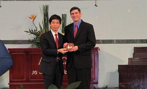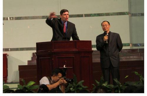 葛培理布道团亚洲部主任亨利·贺理牧师夫妇参加了此次聚会,聚会中葛卫理牧师证道《生命中的选择》。深圳梅林教堂蔡博生牧师,赠送纪念礼物给葛培理布道团并与葛卫理牧师合影留念。