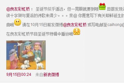 圣诞节似乎还遥远,但是一晃眼就要到了。从9月15日到10月15日,良友电台开展征集有关耶稣诞生的原创歌词活动,欲为征集到的歌词谱曲并在圣诞节时播出。