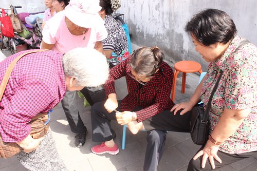 19日在北京基督教会缸瓦市堂前举办的慈善周活动中,一位给老人剪脚趾甲的侍奉者使82岁的姊妹感动的流泪,参与理发服侍的同工过来询问她的姓氏,并说“太伟大了”。