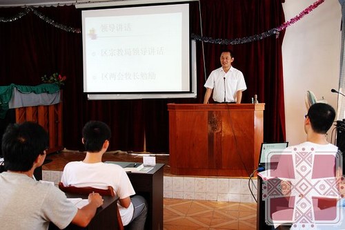 王从联牧师勉励学员2012年9月10日,广西基督教两会第十九期圣经培训班举行开学典礼。广西基督教协会会长王从联牧师、培训班部分任课老师,以及广西壮族自治区宗教事务局吴汉时调研员等莅临典礼。培训班班主任孙红忠牧师主持开学礼拜、李顺子牧师证道,王从联牧师祝福。本期培训班共招收学员35名。