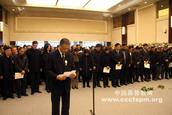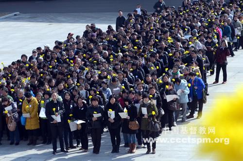 上午8时许,就陆续有前来参加告别仪式的各界人士、教会信徒到达,他们身着深色衣服、手持黄色的菊花,神色凝重、充满悲伤,有的眼里噙着泪水。到告别仪式开始时,博爱厅已经聚集了近1500多人。