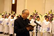 博爱厅布置得庄严肃穆,丁光训主教的遗体安放在鲜花丛中。正前方墙的正中央、高高悬挂着丁光训主教的遗像,相片中的主教身着紫色主教服、胸前佩戴着十银色的十字架,雪白的头发,慈祥而又矍铄。遗像的正上方,紫色底上写着“丁光训主教安息主怀”。