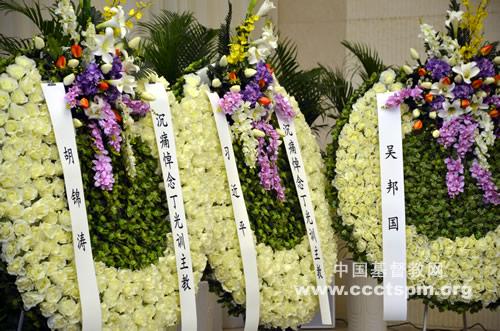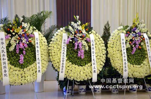 胡锦涛、习近平、吴邦国、温家宝、贾庆林、李克强、张德江、俞正声、刘云山、王歧山、张高丽等党和国家领导人以及中共中央、国务院、人大常委会、全国政协等国家机关、有关全国、省、市统战、宗教部门以及各基督教团体、个人所送的花圈摆满了整个大厅的两边。中共中央政治局常委俞正声、全国政协副主席郑万通、中共中央统战部部长令计划等领导专程赶到南京参加了丁光训主教的遗体告别仪式。