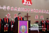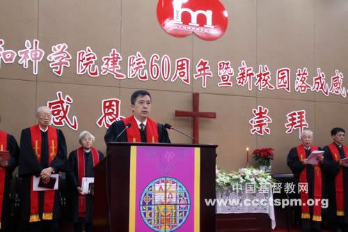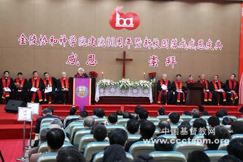 上午9时,在学院礼堂举行了感恩庆典。王作安局长宣读了回良玉副总理的贺信,回良玉副总理在贺信中指出:60年来,金陵协和神学院坚持正确办学方向,坚持“三自”原则,坚持走爱国爱教道路,培养了一大批合格人才,为中国教会输送了新生力量,为推进中国基督教神学思 想建设、引导基督教与社会主义社会相适应做出了重要贡献。希望你们以建院60周年为契机,在已有成绩基础上继续努力,不断探索有中国特色的基督教神学教育的道路,努力把金陵协和神学院打造成为培养教牧人员的重要基地、开展神学思想建设的重要阵地和展示中国宗教信仰自由政策的重要窗口,为促进社会和谐做出新的、更大的贡献。