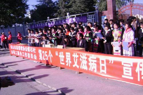 防艾宣传队伍当中圣经学校的学生穿着统一的民族服装、校服,唱诗班唱基督教赞美诗歌,戴着“基督教防艾宣传”的匹带,到大街发放防艾宣传资料,北关教会、漾田教会的信徒带来了锣鼓,到大街上排成队伍敲锣打鼓的宣传预防艾滋病,震奋人心的锣鼓声吸引了许多的路人及开门做生意的人,忍不住要看发生了什么事,同时拿到宣传单也认真的在看,开车的司机也忍不住停下车来拿一份宣传资料看看,有人说:“今天什么日子,怎么到处都在宣传艾滋病,到底艾滋病是什么病,我也拿这些宣传单回去看看.....”;我们在游街宣传的同时也看到不同的单位和组织在不同的公共处所也在宣传预防艾滋病;“全党动员、全民参与,艾滋病虽然可怕、但更可怕的是我们不同心、向艾滋病低头了,在党的领导和支持下,全民参与共同打一场禁毒防艾的人们战争,我们看到不同的人在宣传预防艾滋病的同时也看到了希望,团结起来一定能把艾滋病打倒!”。