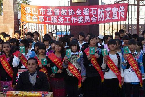 12月1日,根据云南省保山市“12.1”第25个“世界艾滋病日”宣传预防艾滋病的统一部署,在市区委统战部、市区民宗局、市区防艾办、区疾控中心的支持下,由保山市基督教协会磐石社会事工服务工作委员会防艾项目同工、保山市基督教民族圣经学校师生,北关教会、漾田教会信徒组成了130多人的防艾宣传队伍,到隆阳区九龙路车管所大门口开展艾滋病预防宣传活动。使政府组织和非政府组织、信教群众和非信教群众共同参与防艾事工,彼此鼓励、学习,共同携手抵抗毒品、揭制艾滋病。