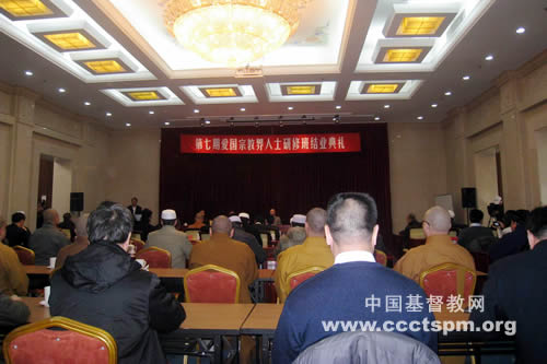 第七期爱国宗教界人士研修班结业典礼于2012年12月21日在中央统战部举行,中国人民大学哲学院院长郝立新主持,中国人民大学书记程天权致辞,热烈祝贺52位学员完成学业。教育部高等教育司副司长刘贵芹在讲话中认为研修班通过对国家政策法规课程的学习,提高了自身政治素质;通过对宗教专业课程的学习,提高了宗教造诣水平;通过对中国文化人文课程的学习,为提高文化素质,打下良好的基础。充分肯定研修班达到既定目标,取得预定效果,开阔了眼界、收到了很好的效果,研有所获,学有所成。认为研修班的成功举办,主要是因为领导的重视;承办学校的精心施教;学员们的勤奋刻苦。从2006年开始的七期研修班成功举办证明:有关部门领导充分利用高校资源,来培养爱国宗教界人士,决策英明、效果明显,教育部在今后的工作中将总结经验,根据中央统战部的要求,不断推进培养工作。5位学员代表也分别作了发言,各位领导也分别向学员代表颁发了中国人民大学的结业证书。