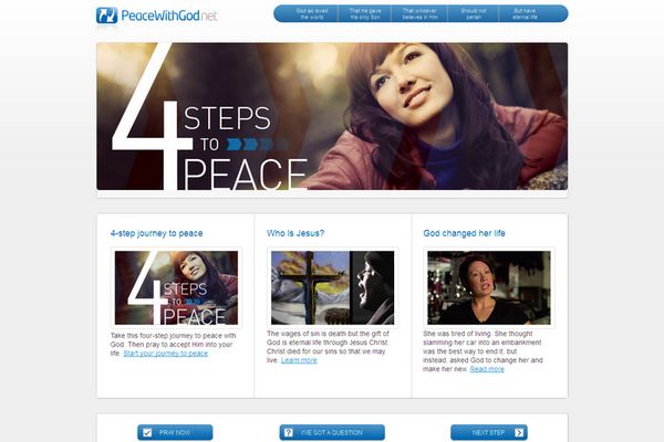 据了解,PeaceWithGod.net运用搜索引擎营销和视频展示等手段吸引浏览者,是葛培理布道团和Jesus.net合作运营的。Jesus.net是一个国际性网络,由40多个涉及网络事工的团体所组成。