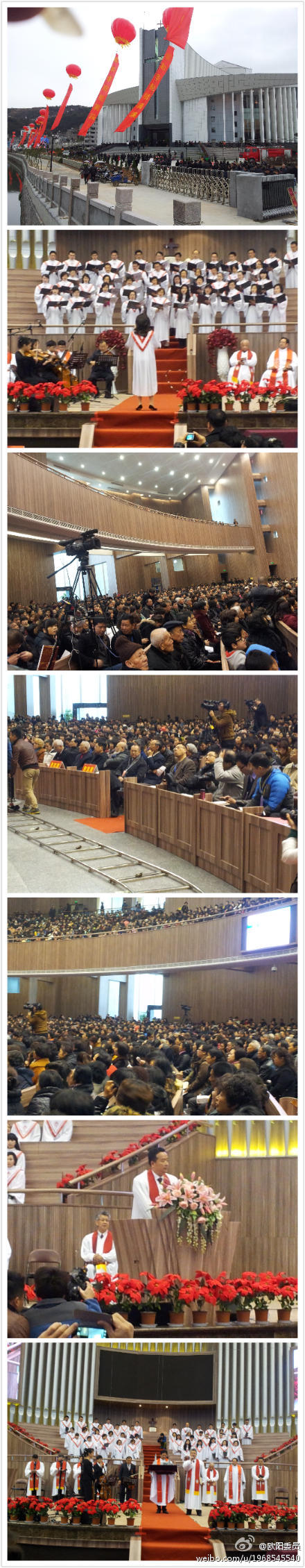 2月19日开始的温州乐清柳市基督教堂落成感恩庆典吸引很多人关注,两天一夜的庆典过程都通过网络进行直播,一些网友还通过微博分享典礼的情况,网友欧阳委员通过微博上传了一些典礼的照片。