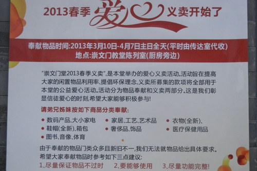 崇文门堂表示,这个是彰显信徒爱心的时刻,希望信徒们能够积极参加。据该堂一位服侍人员透露,义卖将在4月14日(周日)举行,地点可能在该堂附近的一个院子里。