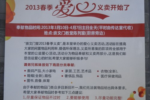 3月24日北京基督教会崇文门堂的第三堂主日礼拜临近结束时,段金鑫教士报告了春季义卖活动的日期。春季义卖的日期是:4月14、21、28日(周日)。崇文门堂欢迎弟兄姐妹将家中闲置可用的物品奉献出来,教会随时有义工接收。此次义卖活动所得款项将全部用于崇文门堂的慈善事工。