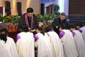 在这个特别的日子里,举行了隆重的圣餐礼。在一曲《爱筵我尝歌》后,大家开始领受圣餐。区别于往常的是此次由王牧师和肖牧师亲自把饼和杯递到信徒手里,每个信徒都跪到讲台前以一颗虔诚恭敬的心来领受这象征着主身体和宝血的饼和杯。