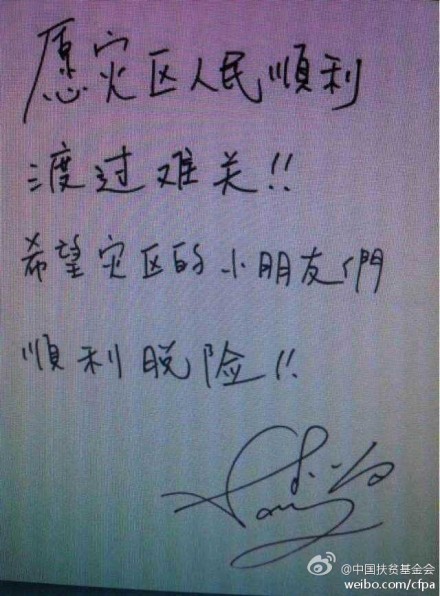 4月21日,中国扶贫基金会发布微博,证实了周杰伦捐款100万,并表示他是第一个响应的明星。