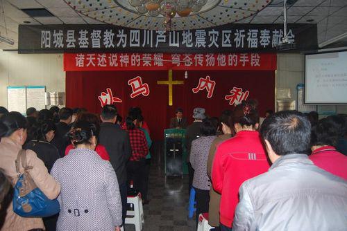 山西省阳城县基督教两会当获悉四川省雅安市芦山县遭受7.0级地震,200余人遇难,20多人失踪,16000余人受伤,住进了医院的消息后,立即召开电话会议,研究决定立即号召全县基督徒,举起圣洁的双手,为庐山地震灾区,在永生上帝面前祈祷,并决定2013年4月21日礼拜结束后,全县各个聚会点举行“为庐山地震灾区祈福、奉献会”。